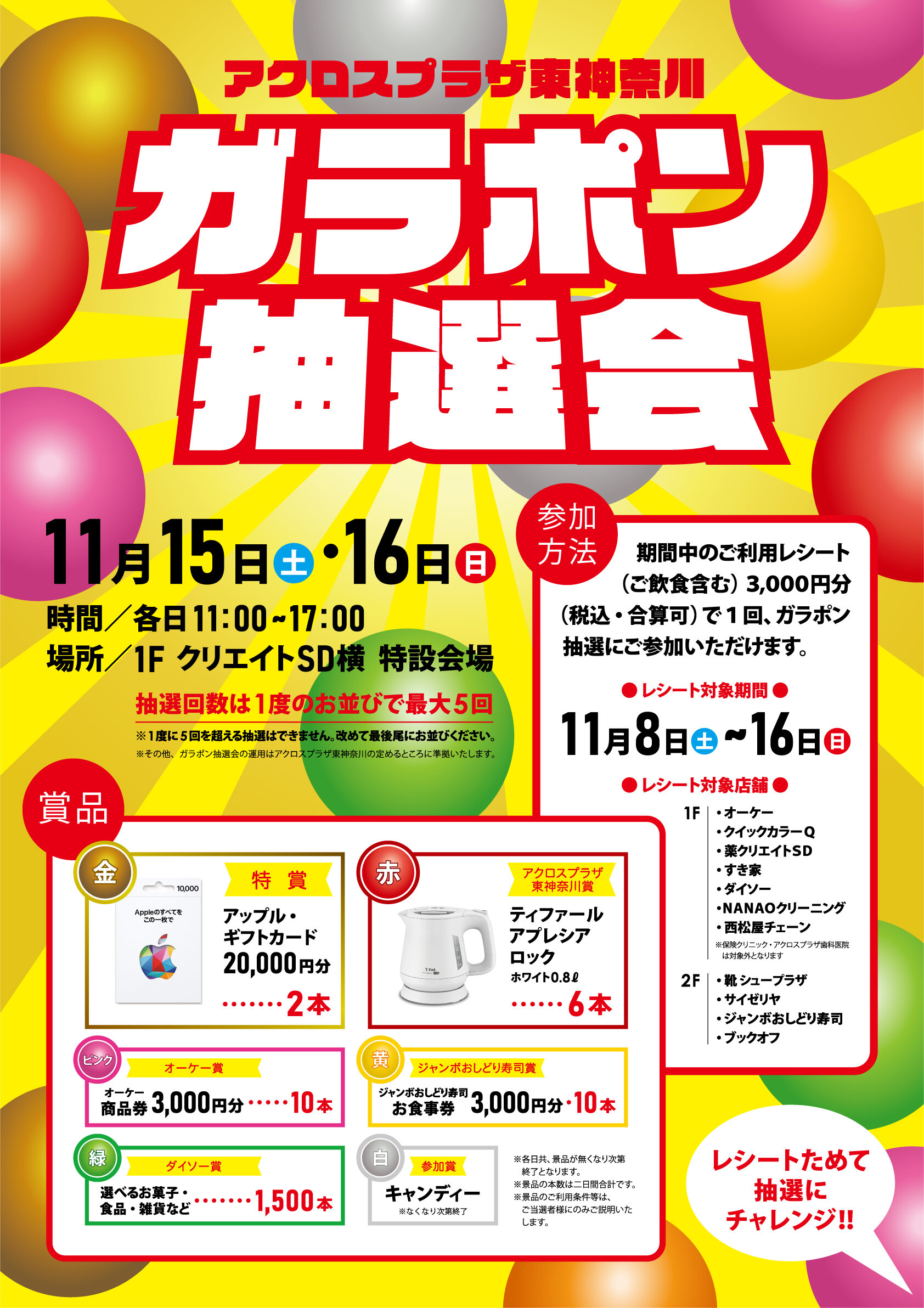 期間中のご利用レシート(ご飲食含む)3,000円分(税込・合算可)で1回、ガラポンにご参加いただけます。